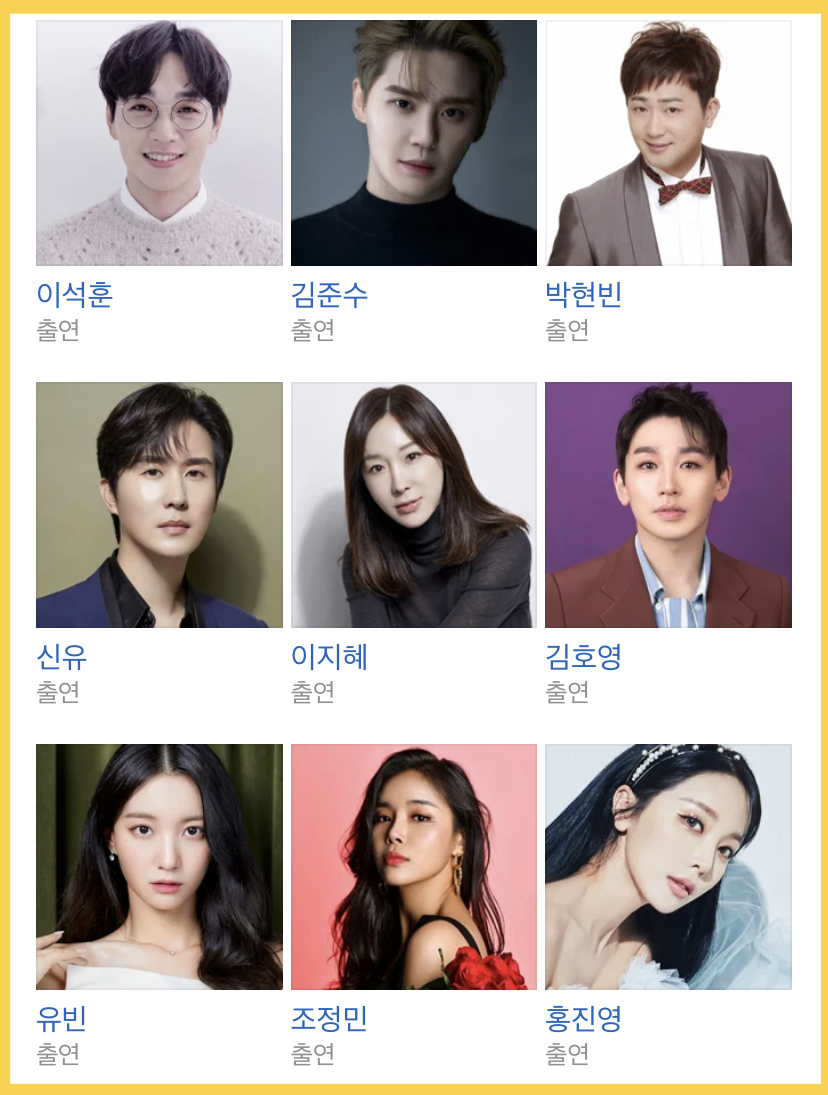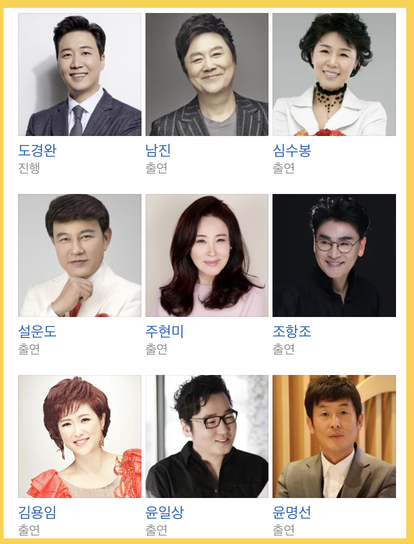 - 트롯계의 전설부터 작곡가와 발라드 가수, 트롯 가수, 뮤지컬 배우 등 출연진들의 반응을 보는 재미도 더할 것 같습니다.